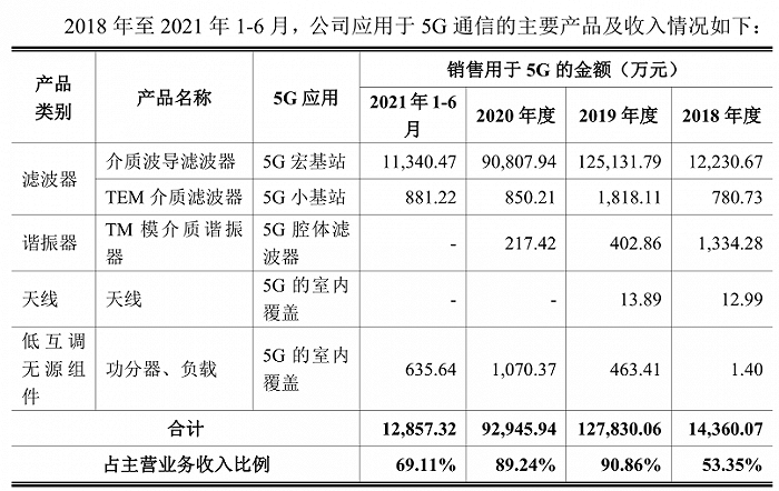 灿勤科技主要产品包括介质滤波器、介质谐振器和介质天线,其中滤波器作为主要产品占公司2021年上半年收入的88.86%。