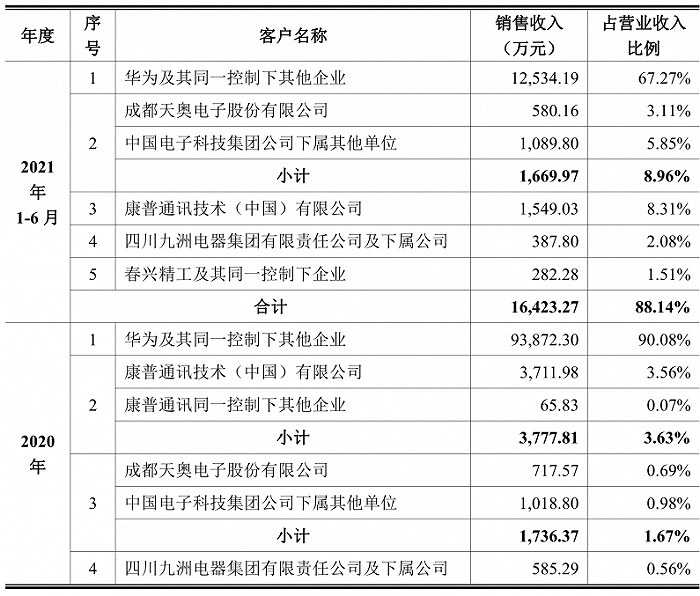 2021年上半年,灿勤科技来自航天军工体系的收入比例显著增加,中国电子科技集团公司下属其他单位占收入比例从2020年的0.98%增至5.85%,四川九洲电器集团有限责任公司及下属公司的收入比例从2020年的0.56%增至2.08%。