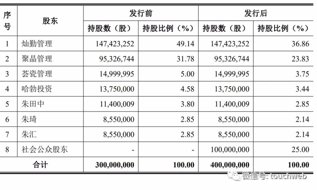 IPO后,灿勤管理持股为36.86%,聚晶管理持股为23.83%,荟瓷管理持股为3.75%,哈勃投资持股为3.44%;朱田中直接持股为2.85%,朱琦直接持股为2.14%,朱汇直接持股为2.14%。