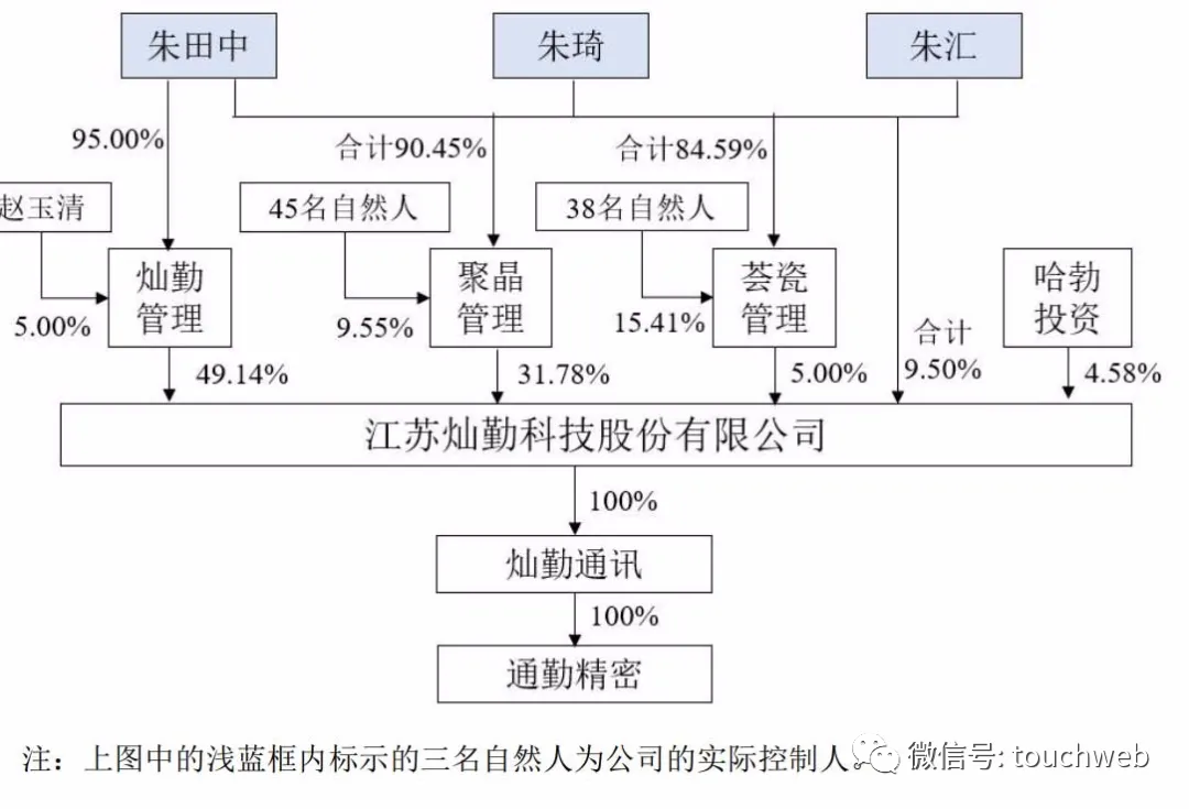 IPO前,灿勤科技实际控制人朱田中、朱琦、朱汇合计控制公司95.42%的股份。朱田中、朱琦和朱汇,朱田中与朱琦、朱汇为父子关系。