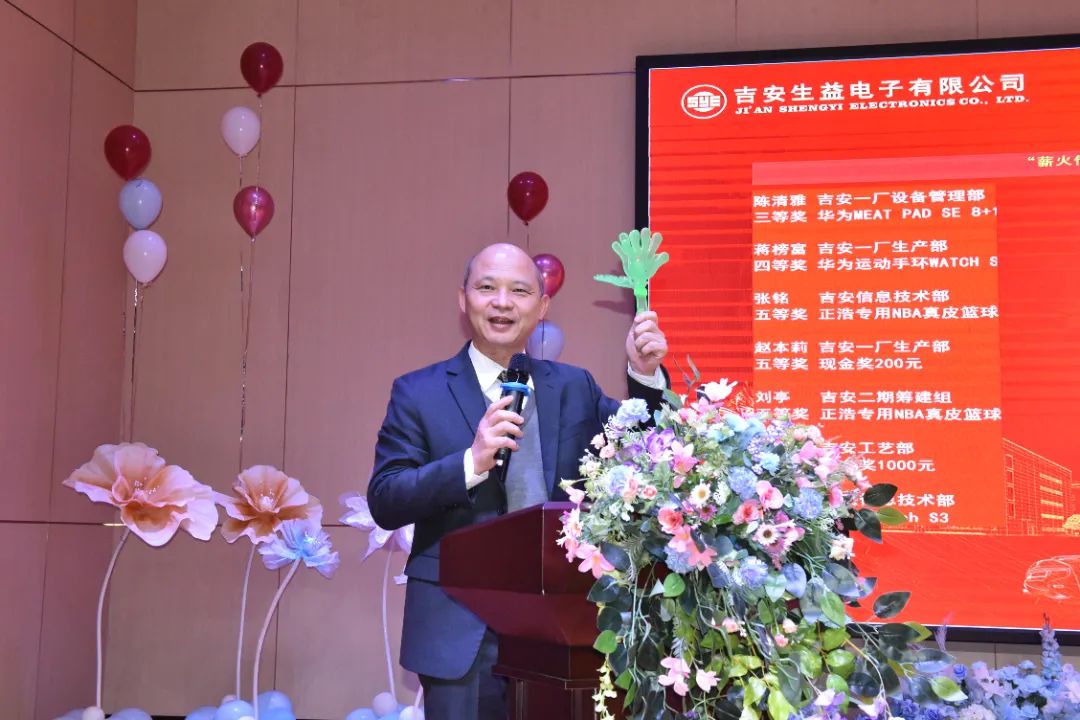 张董首先对吉安生益电子取得的成绩表示肯定,感谢吉安生益电子全体同仁的努力。同时也对吉安生益电子新的一年寄予新的希望,一是希望全面推行零缺陷管理;二是希望吉安生益电子继续充满信心、团结协作、共同奋斗;三是希望继续打造持续改善平台或赋能平台。让个人的成长和公司的成长相互映衬、相互成就。