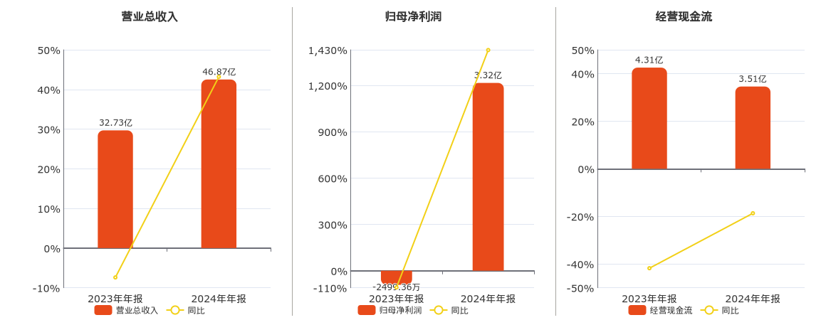 公司营业总收入为46.87亿元,较去年同报告期营业总收入增加14.14亿元,同比较去年同期上涨43.19%。归母净利润为3.32亿元,较去年同报告期归母净利润增加3.57亿元。经营活动现金净流入为3.51亿元。