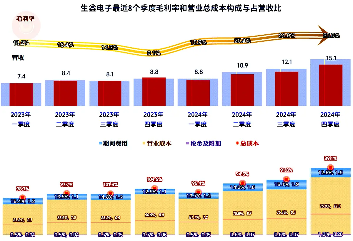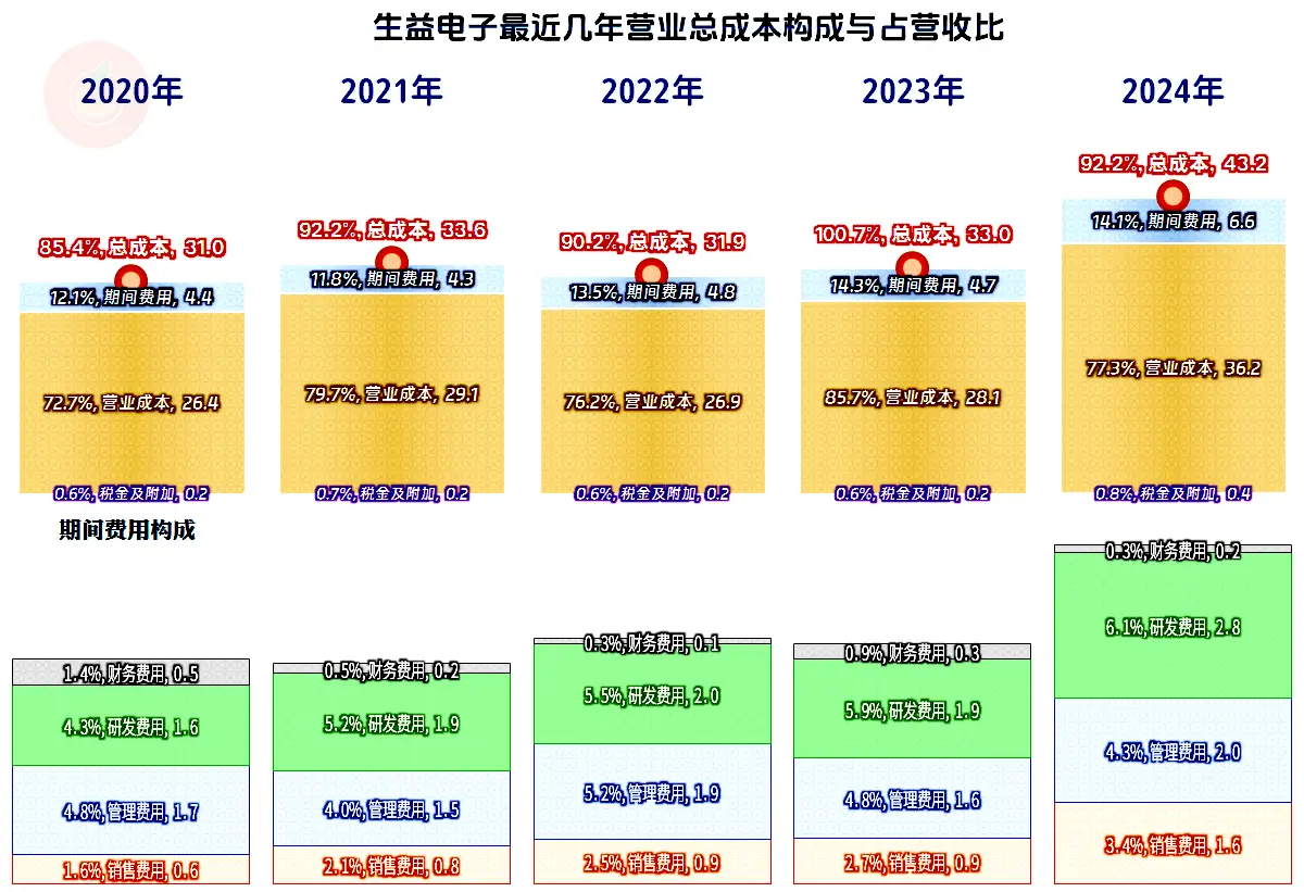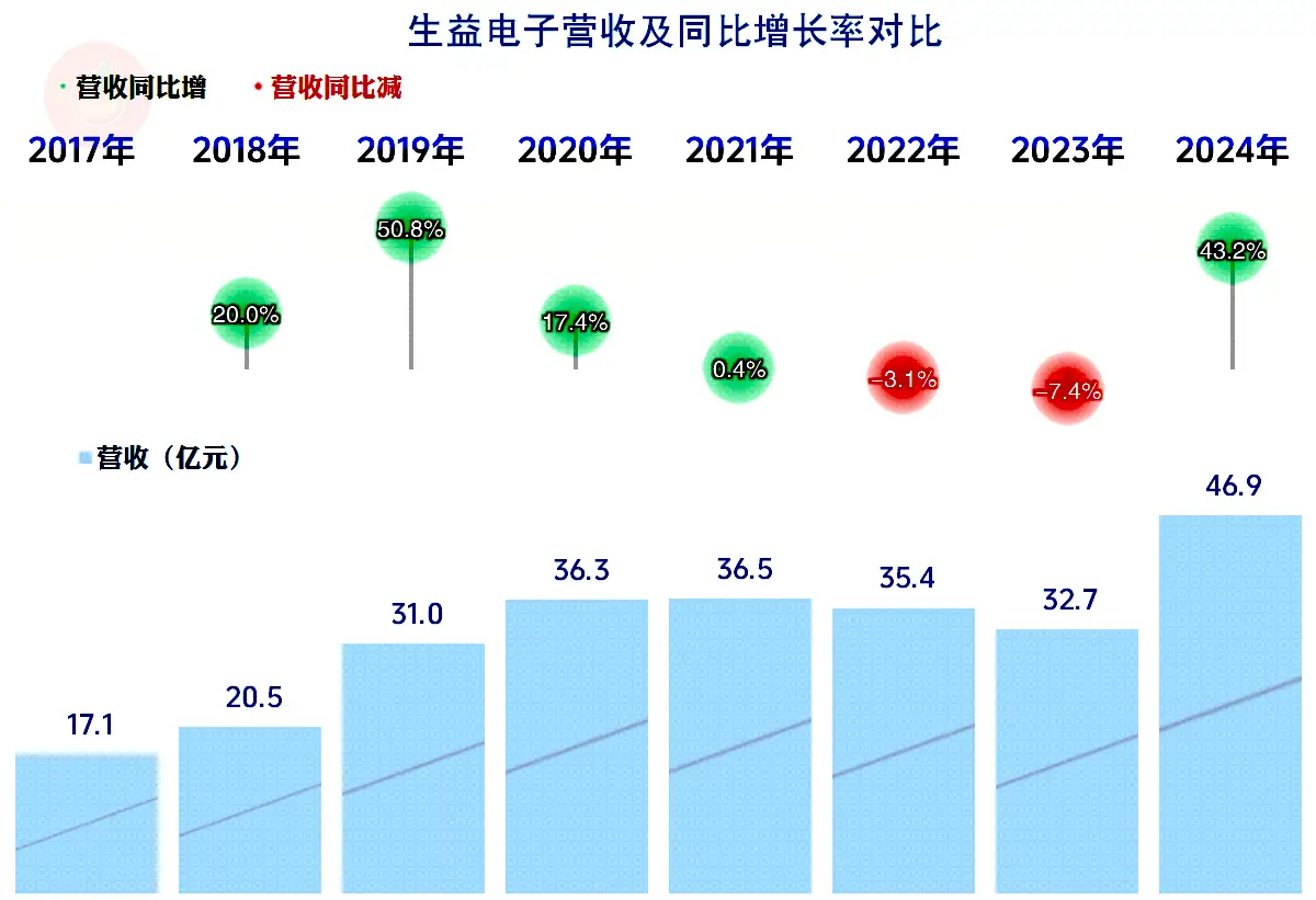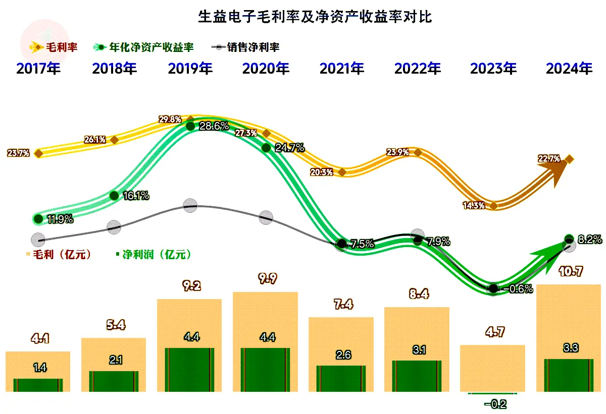 2024年,生益电子的营收同比增长了43.2%,总算摆脱了前两年持续阴跌的不利局面。和我们看过的深南电路和沪电股份等同行情况差不多,大家在2024年都算过得不错的。