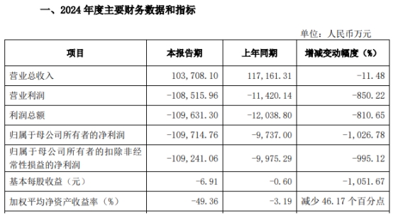 帕瓦股份(688184.SH)昨晚披露的2024年度业绩快报公告显示,公司2024年实现营业总收入103,708.10万元,同比下降11.48%;归属于母公司所有者的净利润-109,714.76万元,上年同期为-9,737.00万元;归属于母公司所有者的扣除非经常性损益的净利润-109,241.06万元,上年同期为-9,975.29万元。