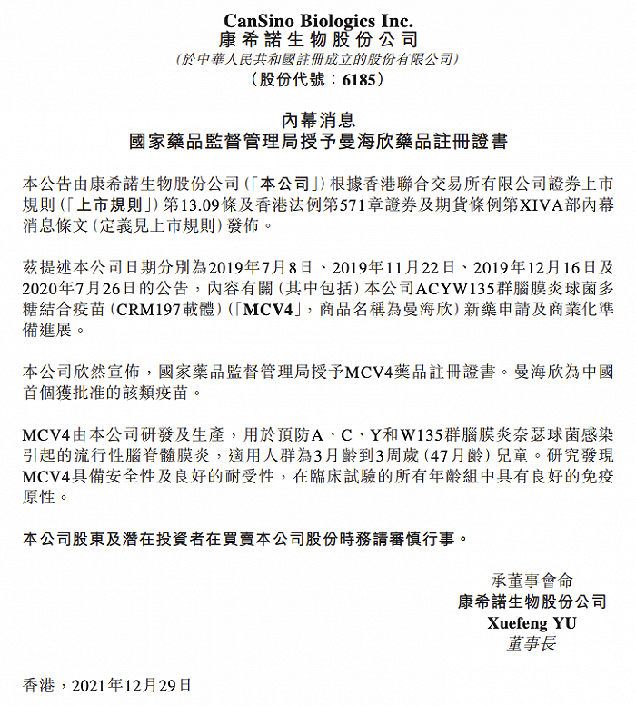 康希诺生物12月29日午间在港交所公告,国家药品监督管理局授予MCV4药品注册证书。曼海欣为中国首个获批准的该类疫苗。MCV4由公司研发及生产,用于预防A、C、Y和W135群脑膜炎奈瑟球菌感染引起的流行性脑脊髓膜炎,适用人群为3月龄到3周岁(47月龄)儿童。研究发现MCV4具备安全性及良好的耐受性,在临床试验的所有年龄组中具有良好的免疫原性。