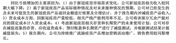 年报指出,2023年同比亏损加大主要仍与新冠疫苗收入下滑、冲减成本、计提资产减值等有关。