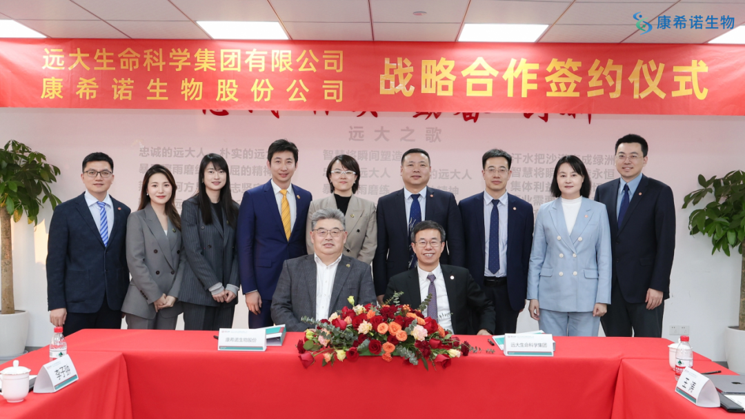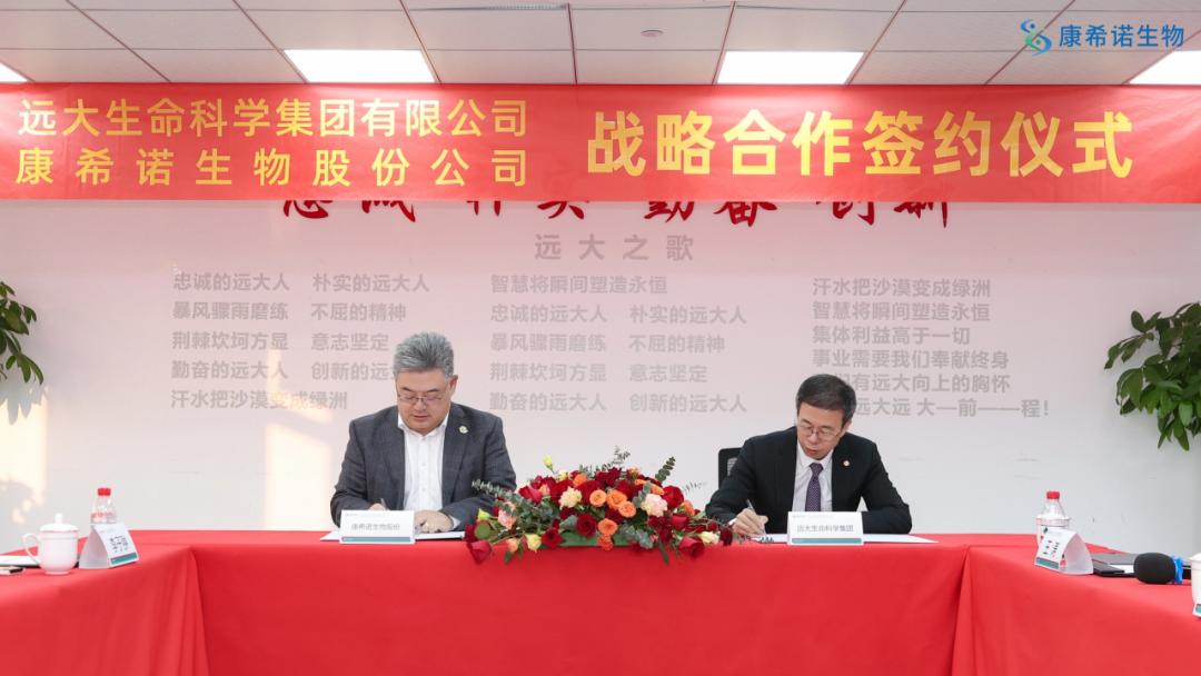 康希诺生物董事长兼首席执行官宇学峰、远大生命科学集团董事长冯增辉代表双方签署战略合作协议。
