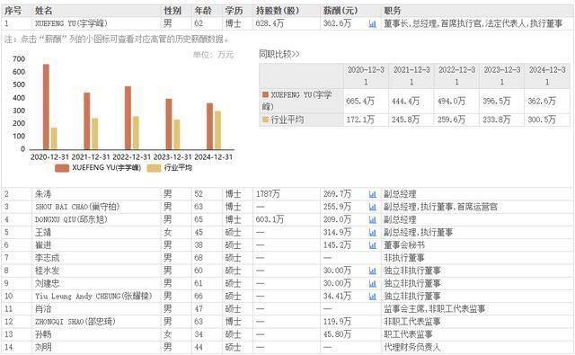 尽管康希诺在过去几年中面临了一定的财务压力,但宇学峰先生的薪酬并未因此受到太大影响。根据东方财富的数据显示,从2020年至2024年,宇学峰的薪酬分别为665.4万元、444.4万元、494.0万元、396.5万元和362.6万元。尽管薪酬有所波动,但整体而言,宇学峰先生的薪酬水平仍然保持在相对较高的水准。