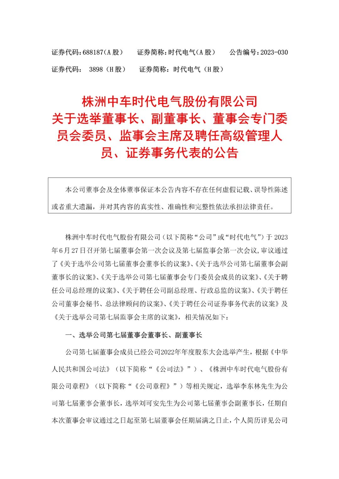 6月27日,中车时代电气发布公告称,第七届董事会成员已经公司2022年年度股东大会选举产生,根据《中华人民共和国公司法》、《株洲中车时代电气股份有限公司章程》等相关规定,选举李东林为第七届董事会董事长,选举刘可安为第七届董事会副董事长。