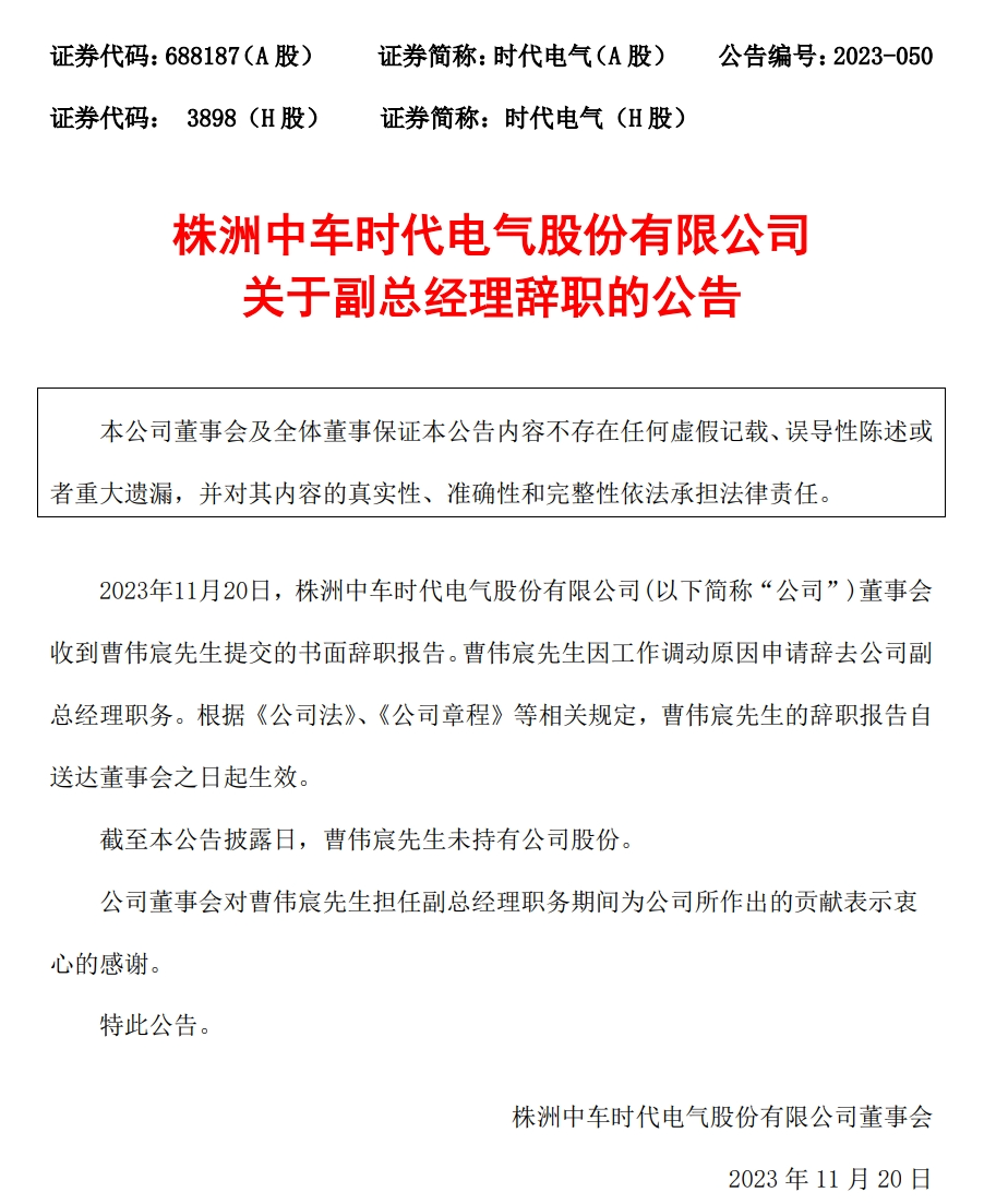 2023年11月20日,株洲中车时代电气股份有限公司发布公告称,董事会收到曹伟宸提交的书面辞职报告。曹伟宸因工作调动原因申请辞去公司副总经理职务。