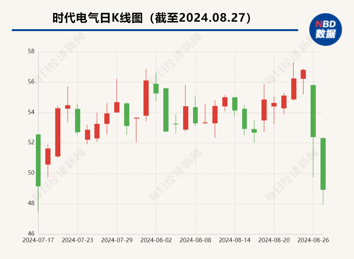 8月27日,时代电气(SH688187,股价48.93元,市值690.67亿元)在开盘后股价便一路走低,一度跌超8%,收盘跌幅为6.62%。上一个交易日,该股票也是在开盘后就下跌,最终跌幅为7.75%。同时,其港股股票——时代电气(HK03898,股价27.350港元,市值386.06亿港元)也收获连续2个大跌。
