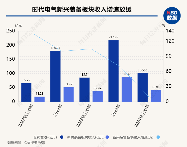 记者统计发现,2022年上半年、2023年上半年,时代电气营收分别是65.27亿元、85.7亿元,对应的新兴装备板块收入分别是18.28亿元、37.49亿元。此外,2022年度、2023年度,时代电气收入分别是180.34亿元、217.99亿元,新兴装备板块收入分别是51.47亿元、87.32亿元。