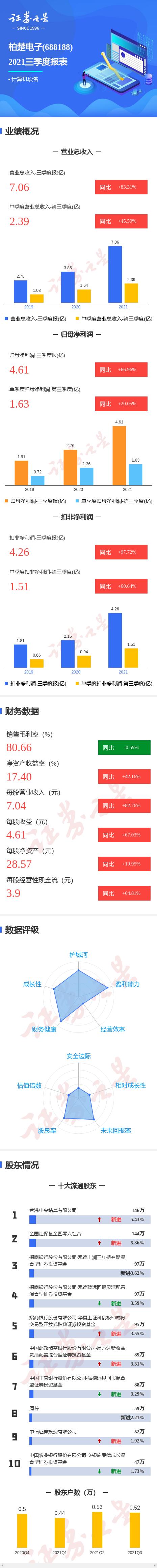 柏楚电子2021三季报显示,公司主营收入7.06亿元,同比上升83.31%;归母净利润4.62亿元,同比上升66.96%;扣非净利润4.26亿元,同比上升97.72%;其中2021年第三季度,公司单季度主营收入2.4亿元,同比上升45.59%;单季度归母净利润1.64亿元,同比上升20.05%;单季度扣非净利润1.52亿元,同比上升60.64%;负债率4.45%,投资收益3169.53万元,财务费用-2134.0万元,毛利率80.66%。