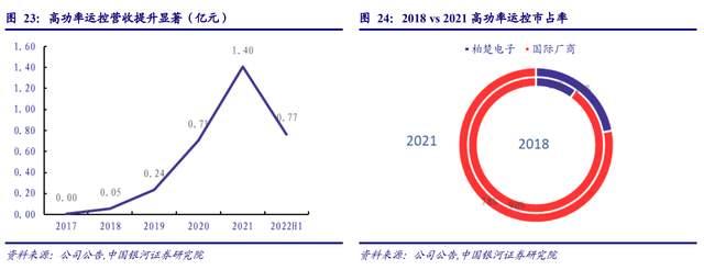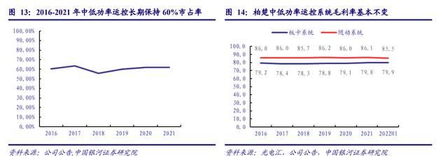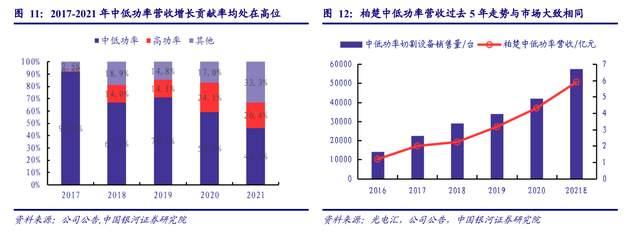 在 2017-2021 年的营收增长中,中低功率运控系统的贡献率分别为 92%/67%/71%/59%/46%。虽呈现逐年下降的趋势,但占比仍处于高位,受益于中低功率市场的需求大幅增长。