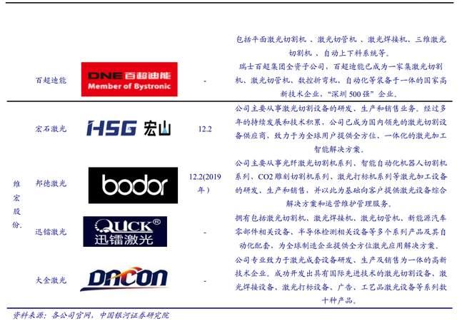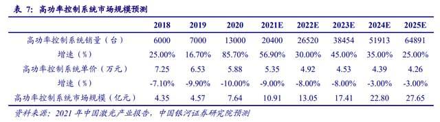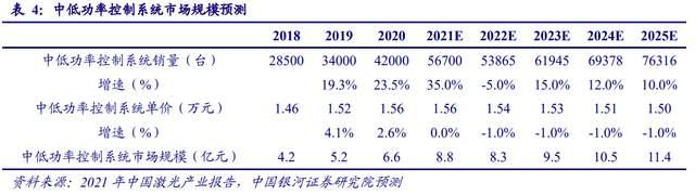 1)由于 2022 年疫情带来的制造业受阻,且中低功率激光的下游行业如机箱机柜,门业、杯业、五金制品、广告装饰等经营同样受到疫情的冲击,加之市场高景气期已过,因此增速大幅下调至-5%。2023-2025 年随着市场需求进入稳步增长状态,增速放缓至 15%/12%/10%。