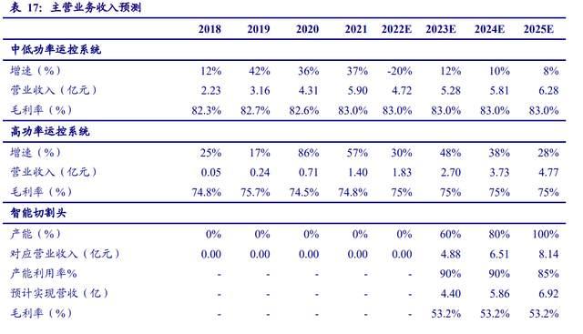 根据募投说明书,2022-2025 年预计达产率分别为 0%/60%/80%/100%,对应营收分别为 0.00/4.88/6.51/8.14 亿元,毛利率预计为 53.23%。由于智能切割头多与公司高功率系统配套售出,预计需求旺盛,我们预测其 2023-2025 年产能利用率分别为 90%/90%/85%。
