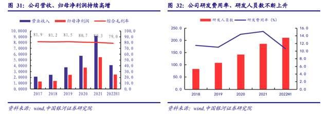 近四年公司的营收和归母净利润持续高增,研发费用率&研发人员数不断增长。2017-2021 年,4 年营收复合增长率达 44.4%,归母净利润复合增长率为 43.1%,两者保持高增长的原因主要有: