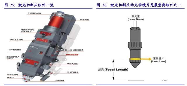 激光器为“心”,运控系统为“脑”,切割头为“手”。激光器、运控系统、切割头并称为激光切割设备的核心部件。其中,切割头负责将激光器产生的激光在切割头内经聚焦镜聚焦,作用于被加工材料表面进行切割。切割头一般由光纤接口、准直模块、聚焦驱动模块、保护镜模块、喷嘴模块等五大基本单元组成。其中,准直、聚焦、保护三大模块均需要光学镜片的参与。因此,光学镜片是第一大溢价筹码。