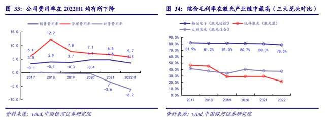 除此之外,公司的综合毛利率在激光产业链(激光器、激光运控、激光设备)中属于最高水平,常年维持在 80%左右,2022H1 毛利率为 79%,相比 2021 年同期略下降 1.8pcts。未来预计随着硬件占比的提高,毛利率仍将有所下降。
