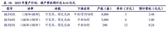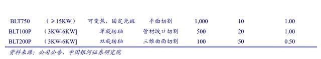 公司在2018年以成立波刺自动化为契机,进军切割头市场,分别于2019年研发成功 BLT83X 系列(6kw-15kw,售价 10 万元,小批量),2020年研发成功 BLT42X 系列(3kw-6kw,售价 3 万元,主推款)和 BLT64X 系列(6kw-15kw,售价 6 万元,主推款)。