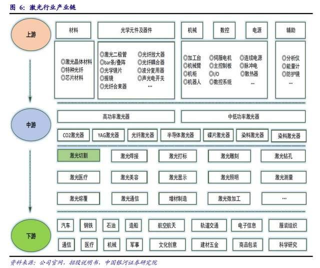 而高功率(6kw-20kw)由于技术壁垒高、产品单价高、受终端产业锂电、光伏、OLED 的高景气度拉动,是目前中游的激光器厂商(IPG、锐科激光、英诺激光、杰普特)和下游的加工设备厂商(大族激光、华工科技、蒂尔激光、亚威股份等)的发展重点。