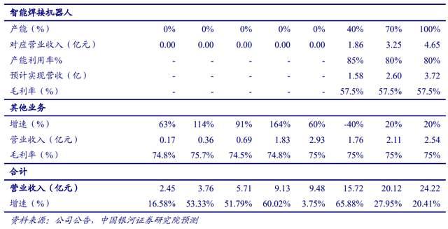 首批客户为宏宇钢构、八方钢构和金凤钢构等中小型钢构企业。2022 年 7 月宣布与国内最大钢结构制造企业——鸿路钢构达成供应合作,迈出了智能焊接业务产业化的第一步。预计将于 2025 年底满产,业务营收达 4.65 亿元。
