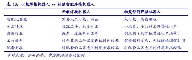 焊接机器人可分为示教焊接机器人和智能焊接机器人两类。示教焊接机器人需要通过人工示教来编辑焊缝的加工路径,由于非标准化操作的示教过程耗时较长,因此示教焊接机器人大多应用于标准化组件的加工中。
