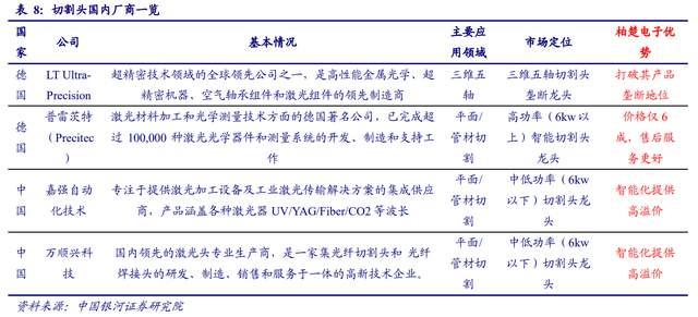 中低功率切割头(6kw 以下)国产化率高,高功率切割头(6kw 以上)是德国厂商的天下。
