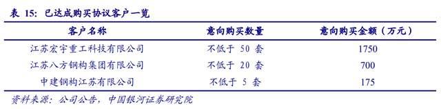 根据公司公告,公司已分别与江苏宏宇重工科技有限公司、江苏八方钢构集团有限公司和中建钢构江苏有限公司签署了意向购买协议,各方拟采购公司研发完成的智能焊接机器人及相关配套系统、配件合计分别不低于 50 套、20 套、5 套,金额分别为 1750 万元、700 万元、175 万元。
