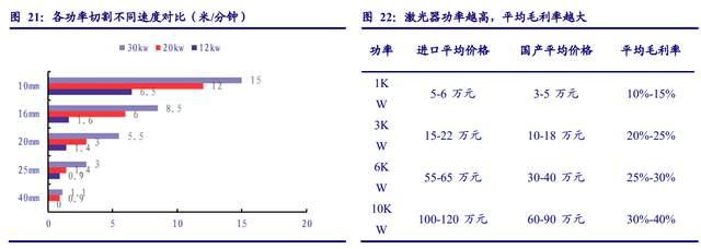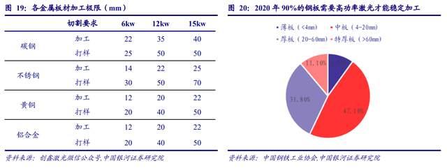 以 2020 年国内产量占比 31.8%的厚板(20-60mm)为例,仅有 15kw 以上的高功率激光器可进行打样,若需要进行稳定加工,更是必须使用 20kw~40kw 的超高功率激光器。