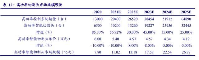 我们预计 2025 年高功率切割头市场规模达 26.8 亿元,23-25 年 CAGR 为 26.6%。