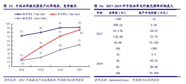 以 1kw 激光器为例,2017年国产平均价格为 10~15 万元,进口平均价格为 12~20万元。2019 年国产平均价格为 3~5 万元,进口平均价格为 5~6 万元,2 年的下降幅度达 50%~80%。