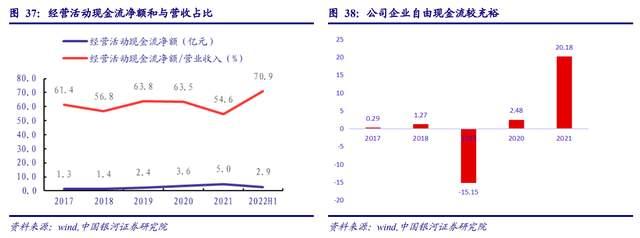 从现金流的角度,公司的现实流充裕,收益质量优质。2017 年-2022H1,公司的收益质量优质,经营活动现金流净额占到营收的 55%-70%左右。现实流充裕,2021 年企业自由现金流达到 20.18 亿。