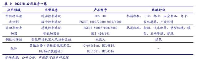 激光控制系统分为随动控制系统、板卡控制系统和总线控制系统,三者 2022H1 营收占比分别为 26.6%/25.4%/18.7%,毛利率分别为 79.9%/85.5%/76.8%。其中,随动控制系统用于控制切割头与待切工件间高度,基本上与板卡控制系统成套销售(2018 年成套销售比达 94%以上),因此可看做同一板块业务。