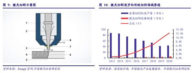 根据国家统计局和激光产业报告的数据,过去几年内激光切割对传统金属切削市场加速渗透,从 2015 年的占比不足 2%持续提升至 2020 年的 12%。