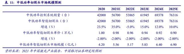 我们预计 2025 年中低功率切割头市场规模达 6.9 亿元,23-25 年 CAGR 为 10%。