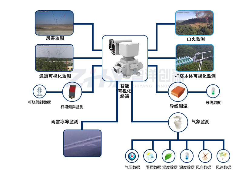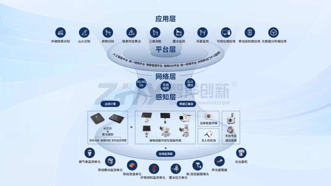 以人工智能多层神经网络和深度学习技术、物联网技术、5G通信技术和大数据分析技术为基础,通过智能终端监拍装置进行实时智能监控。具备运行状态在线监测、故障隐患识别、GIS 地图精准预警、电力设施集成管理、移动互联、三维隐患测距、涉鸟监测等重要功能,并实现了无信号区内线路可视化运维,提前预判隐患故障,避免电网断电、跳闸事故的发生。
