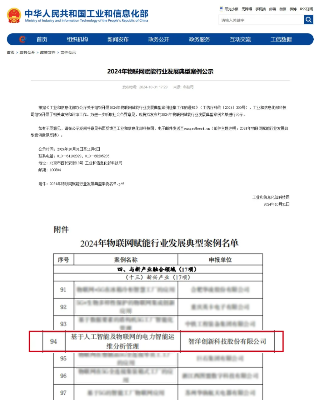 在众多优秀案例中,由智洋创新研发应用的“基于人工智能及物联网的电力智能运维分析管理”脱颖而出,成功入选 2024年物联网赋能行业发展典型案例。