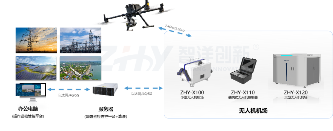 机场与无人机之间可通过2.4GHz或5.8GHz链路实现数据传输,可在机场侧完成数据的存储和初步处理;