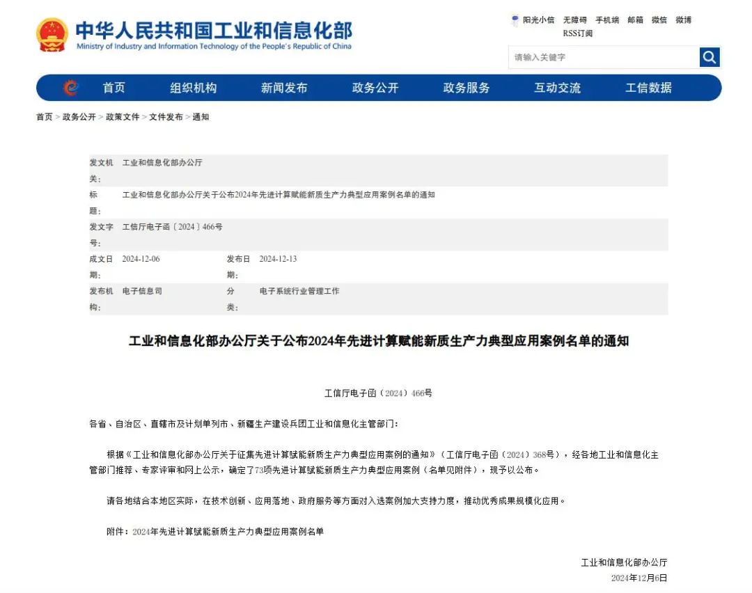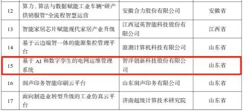 近期,工业和信息化部发布了2024年先进计算赋能新质生产力典型应用案例名单,确定了73项先进计算赋能新质生产力典型应用案例。其中山东省共有7项案例入选,我市智洋创新“基于AI和数字孪生的电网运维管理系统”成功入选传统产业领域案例。