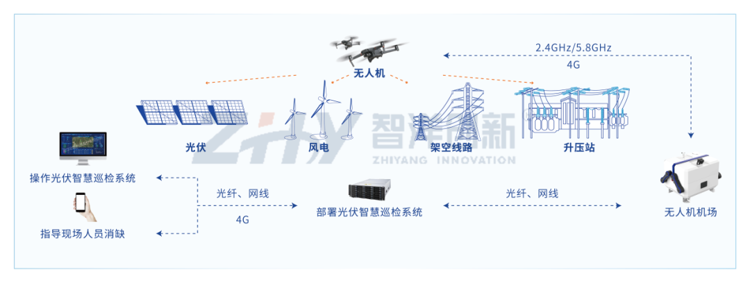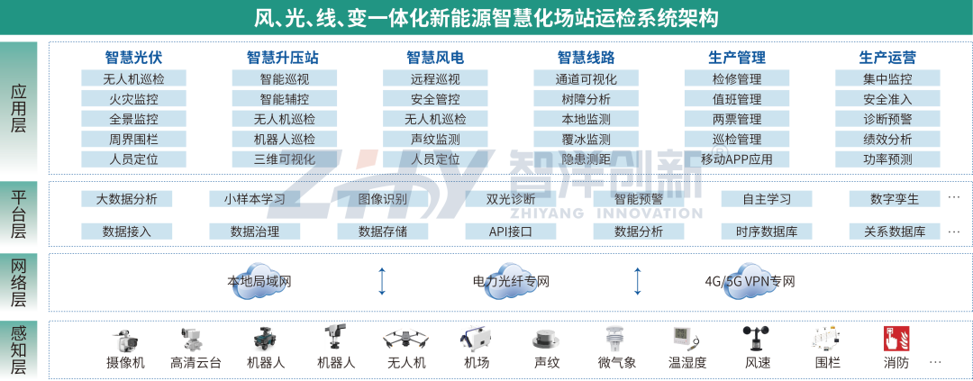 针对光伏场区、风电机组、送出线路和升压站等关键场景,通过应用人工智能技术,结合无人机、机场、可视化监控设备及多元传感器,融合新能源场站运维规程,搭建智慧巡检管控平台,构建高效协同的巡检系统。实现对厂区硬件设施、人员活动及环境因素的精准识别与分析,更快更准地发现隐患,减轻运维人员巡视压力,提高巡检作业效率,实现新能源场站的“信息化,数字化,智能化”。