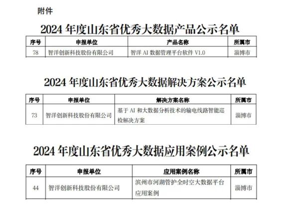 在省级荣誉层面,智洋创新“基于电力行业大模型的智能巡检系统创新应用实践”成功入选山东省首批人工智能大模型典型应用案例名单。此外,在山东省 2024 年度大数据产业“三优两重”项目评选中,智洋创新的三大项目:“智洋AI数据管理平台”、“基于AI和大数据分析技术的输电线路智能巡检解决方案”以及“滨州市河湖管护全时空大数据平台”均榜上有名。