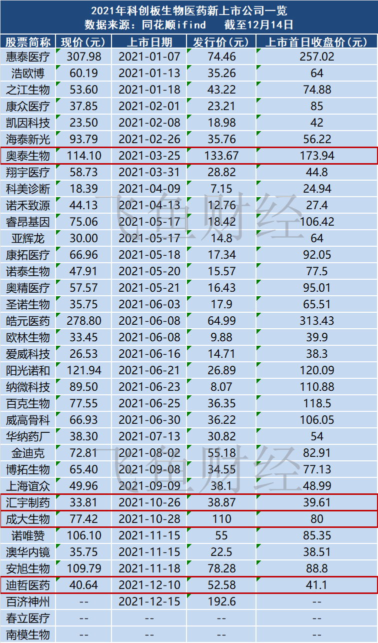 截至目前,今年已在科创板上市的33家创新药企中,有25家公司的股价低于上市首日的收盘价,其中有四家已跌破发行价:奥泰生物、汇宇制药、成大生物、迪哲医药。