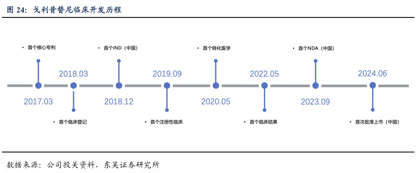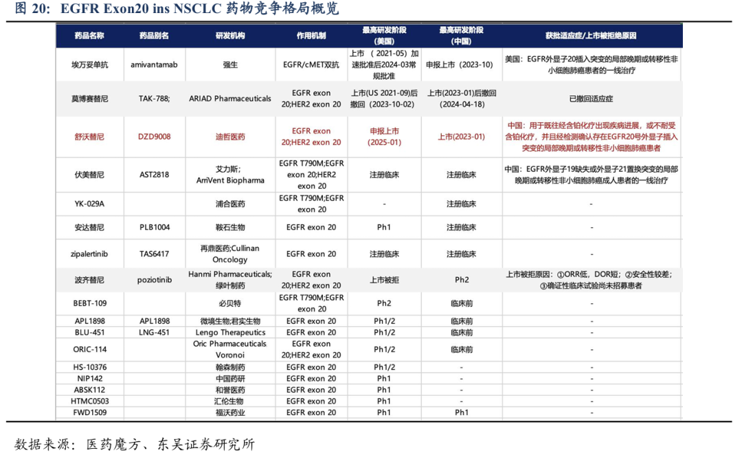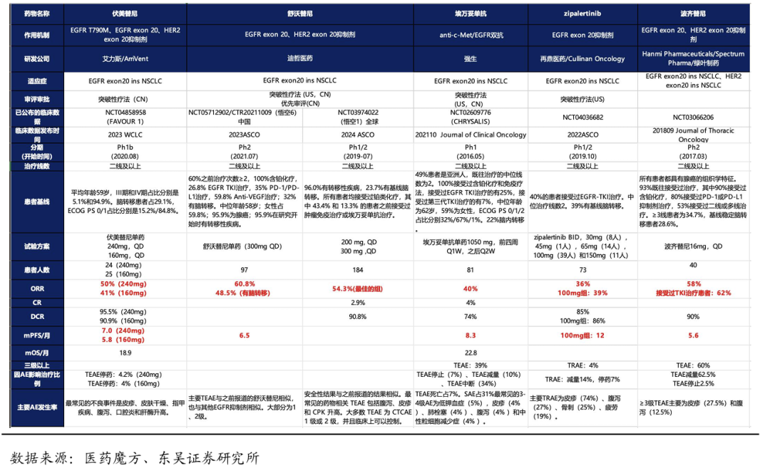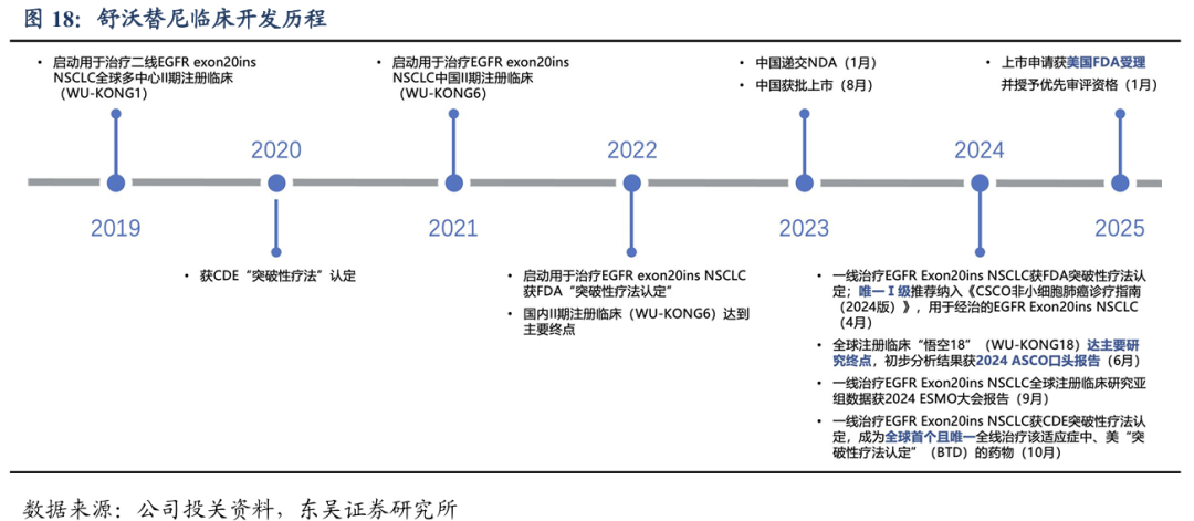 临床开发速度高效,美国商业化即将开启:舒沃替尼自进入临床开发阶段以来,连续三年在ASCO、WCLC、ESMO等国际顶级学术大会亮相并斩获三项口头报告。从国内首例临床研究受试者入组到正式获批上市,仅4年不到时间,突破了肺癌靶向药物临床开发新速度。海外临床试验推进速度也很快,25年1月美国NDA受理并授予了优先审评资格,我们预计2025H2有望实现美国获批上市。作为中国自主研发的首款针对EGFR Exon20 ins突变的肺癌靶向药,舒沃替尼是公司高效源头创新的最好证据,也体现了公司临床开发团队的高效和高标准。