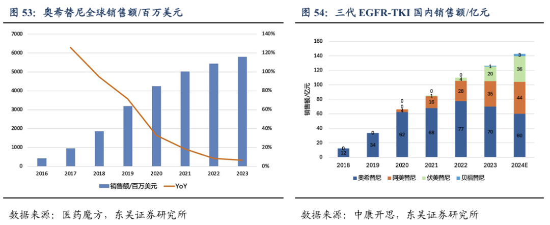 第三代EGFR TKI目前已成为1L EGFRm NSCLC治疗的主流,代表药物为奥希替尼在2023年全球总销售额近60亿美元,我国三代EGFR TKI市场我们预计会达到150-200亿人民币。但与一代和二代EGFR-TKI类似,接受三代TKI治疗的患者不可避免地会出现获得性耐药,且目前已发现多种耐药机制。EGFR TKI治疗后耐药的EGFRm NSCLC市场空间仍然广阔。