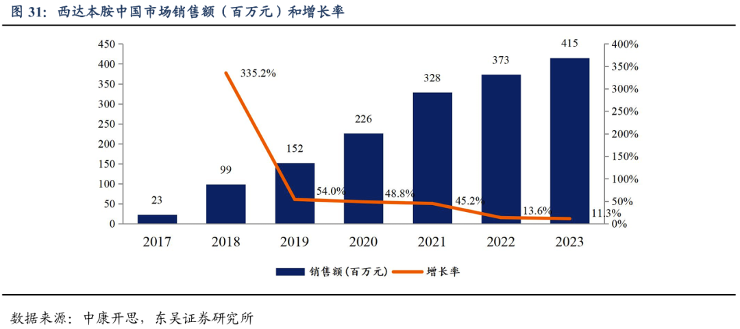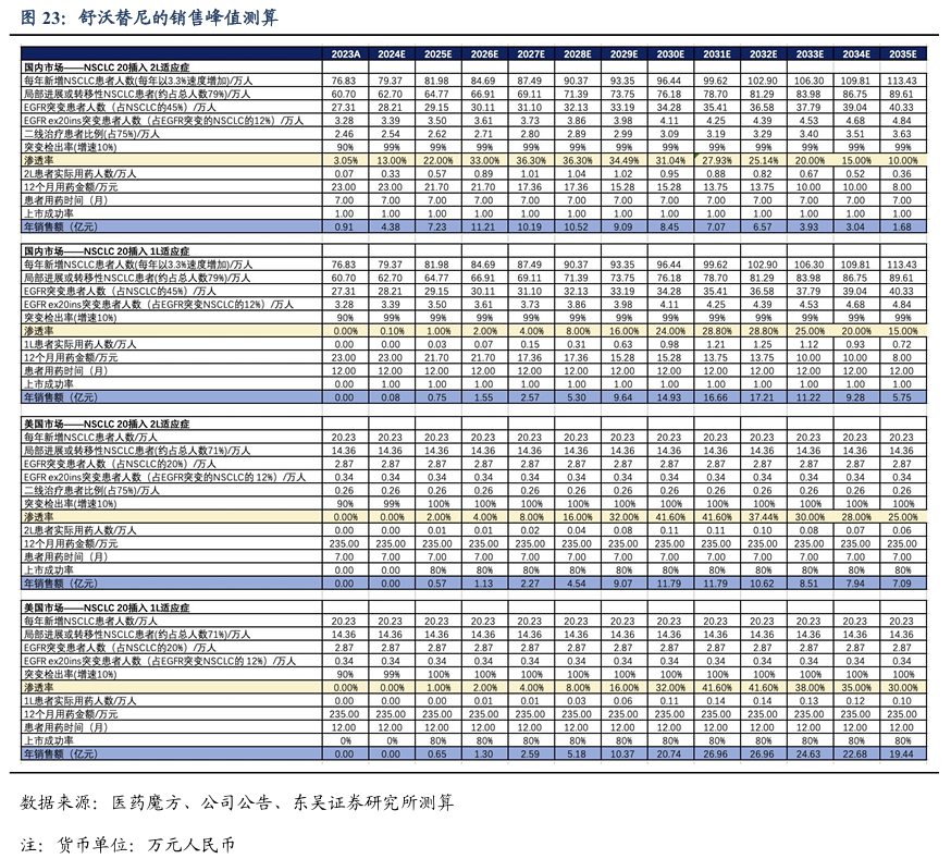 渗透率假设:Exon20 ins NSCLC疗法有限,舒沃替尼的竞争格局良好,假设二线治疗峰值渗透率为36%;一线治疗的峰值渗透率有望达到29%。美国的渗透率有望达到40%左右。