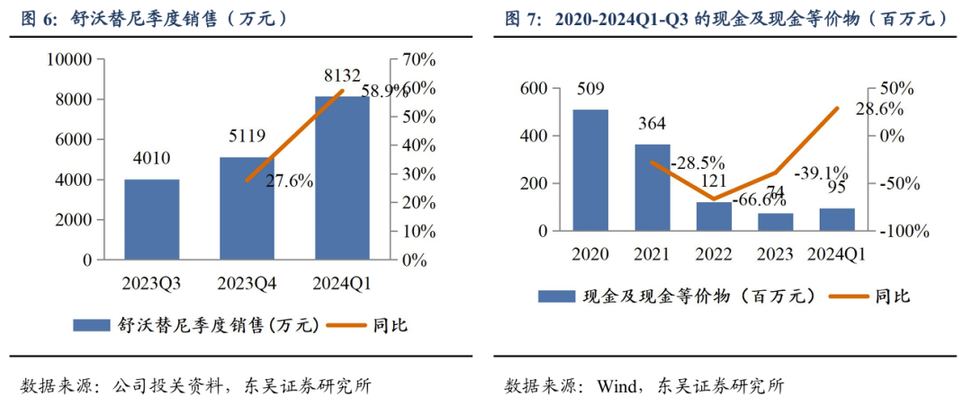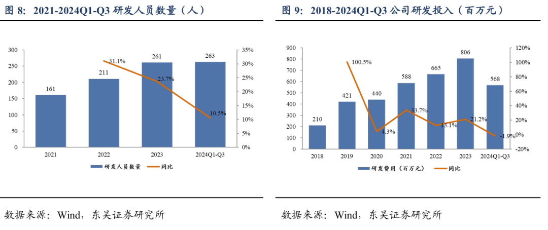 舒沃替尼(舒沃哲)于2023年8月批准上市,2023年度销售收入9128.86万元,2024年Q1/Q2/Q3销售收入分别为8131.86万元/1.22亿元/1.26亿元,环比+59%/+50%/+3%。截至2024年9月30日,公司拥有现金及现金等价物7400万元。公司的研发投入由2018年2.10亿元提升至2023年8.06亿元,2024年Q1-Q3研发投入为5.68亿元,加速推进在研产品临床开发进度。截止到2024Q3,公司在全球10+国家拥有150+临床研究中心,公司研发人员263人,占比32.59%。