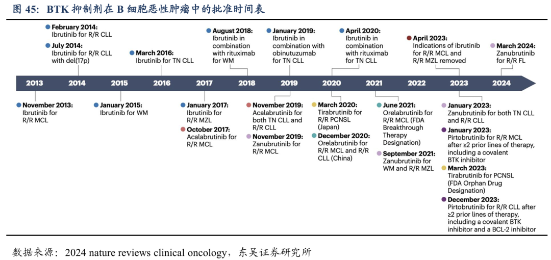 目前全球累计获批6款BTK抑制剂(BTKi),第一代 BTKi:强生/艾伯维的伊布替尼(Ibrutinib);第二代 BTKi:阿斯利康的阿卡替尼(Acalabrutinib)、百济神州的泽布替尼(Zanubrutinib)、奥布替尼(Orelabrutinib,仅中国)和吉利德科学/小野制药的替拉鲁替尼(Tirabrutinib,仅日本);第三代 BTKi:礼来的吡托布鲁替尼(Pirtobrutinib)。尽管BTKi对多种B细胞恶性肿瘤有效,但长期使用BTKi治疗不可避免地会导致耐药性。甚至在DLBCL适应症中目前仍没有BTKi获批上市。