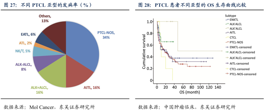 外周T细胞淋巴瘤(PTCL)侵袭性强、预后较差,依靠组织病理学和免疫组化明确诊断。PTCL包含至少29种亚型,最常见的是外周T细胞淋巴瘤-非特指型(PTCL-NOS)、血管免疫母T细胞淋巴瘤(AITL)、间变大细胞淋巴瘤(ALCL)、NK/T细胞淋巴瘤(NKTCL)和成人T细胞淋巴瘤/白血病(ATLL)。