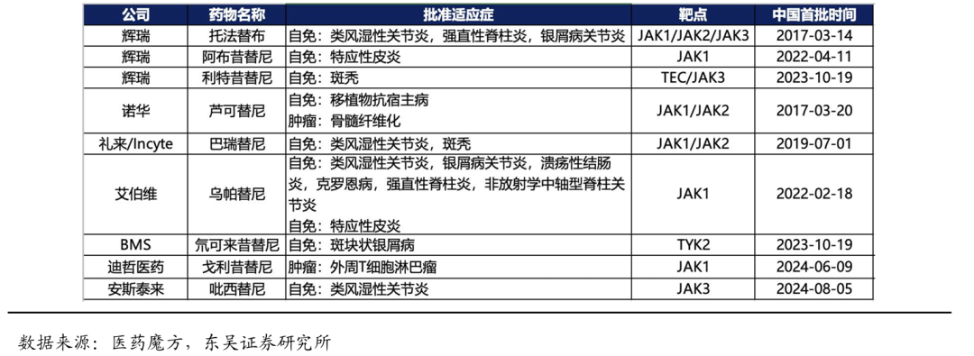 截至2025年1月,中国已批准上市的JAK 抑制剂共9款,除了诺华的芦可替尼获批骨髓纤维化以及迪哲的戈利昔替尼获批PTCL肿瘤适应症,其他JAK抑制剂主要获批适应症为类风湿性关节炎、银屑病关节炎等自身免疫性疾病。JAK抑制剂在自身免疫性疾病中的潜力较大,包括:白癜风、斑秃、炎症性肠病等,在研的品种个数繁多。